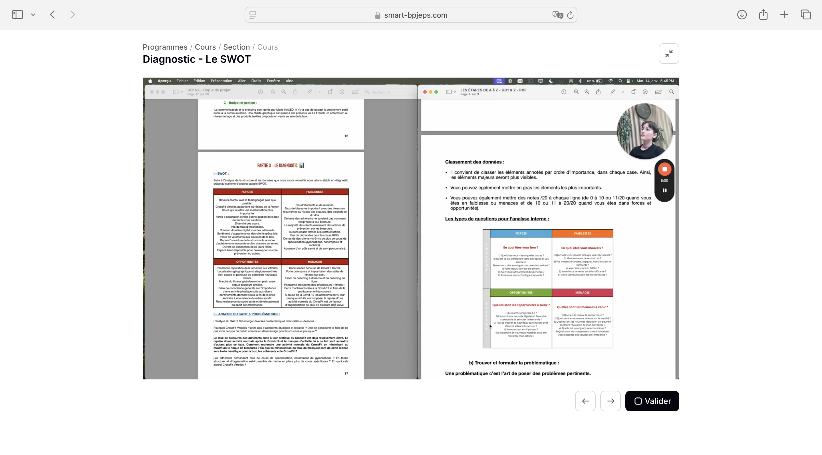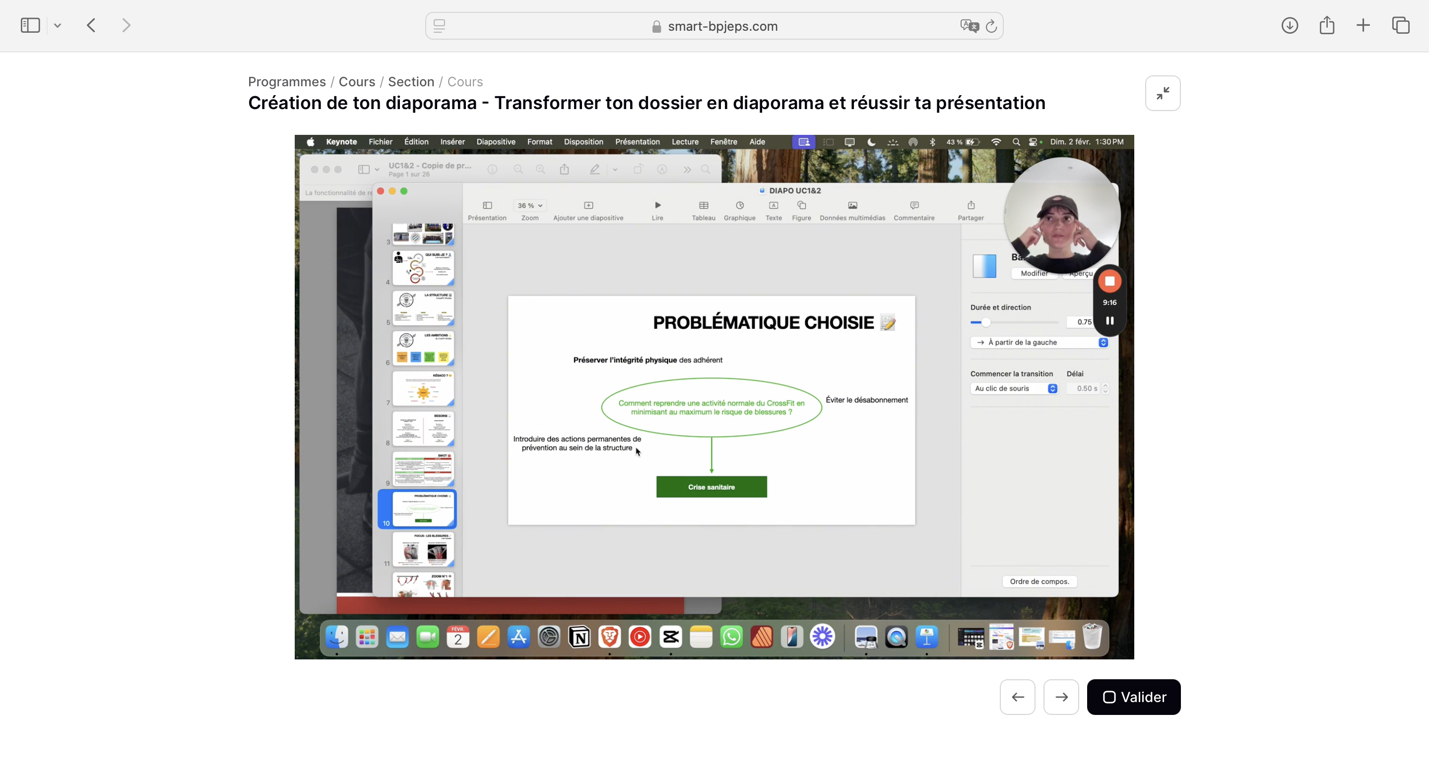 Tu bénéficies de plus de 4 heures de vidéos, réparties selon les 7 phases clés du dossier : mise en page, analyse, objectifs, conception, réalisation, évaluation, annexes, puis diaporama et oral.