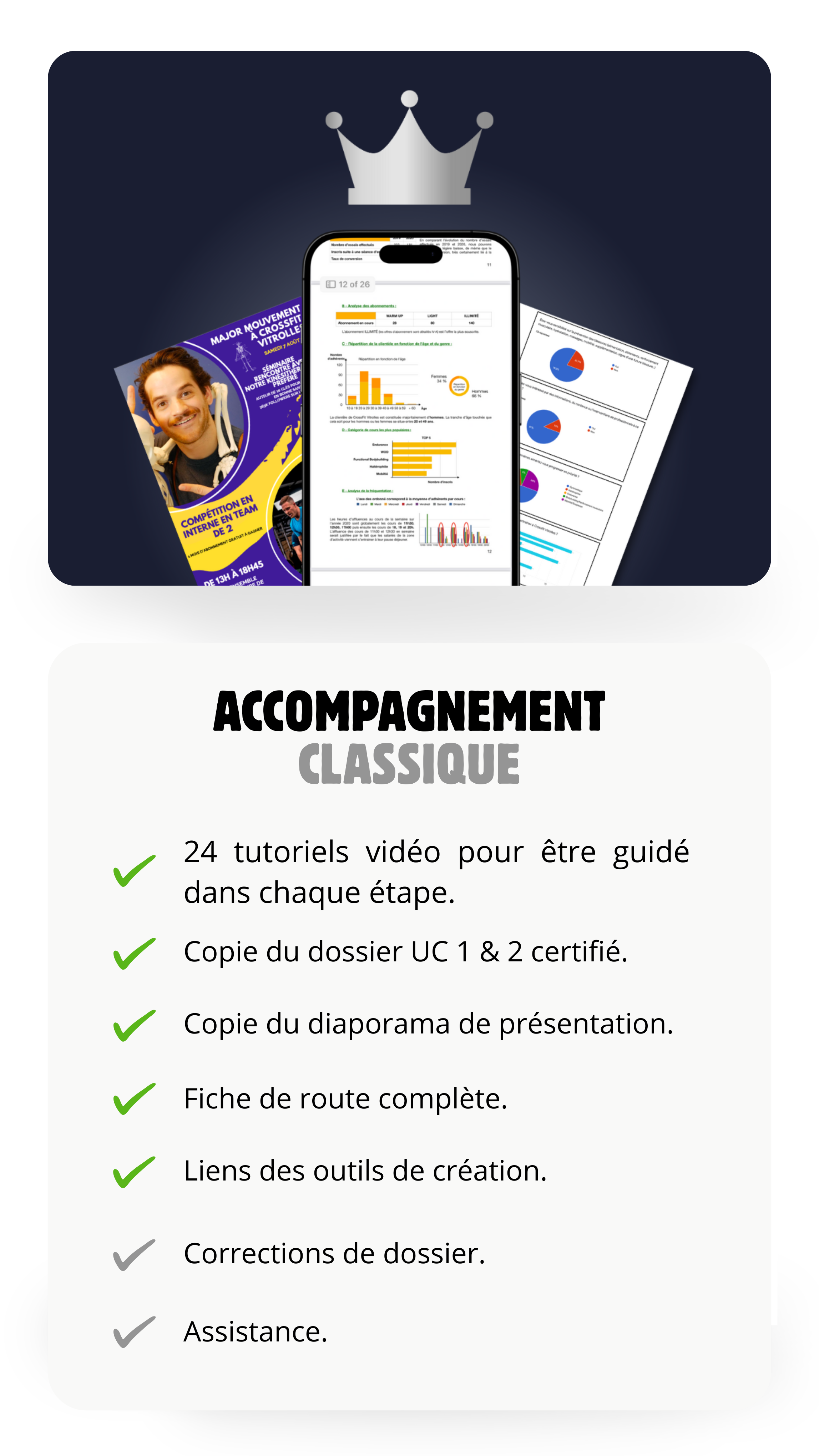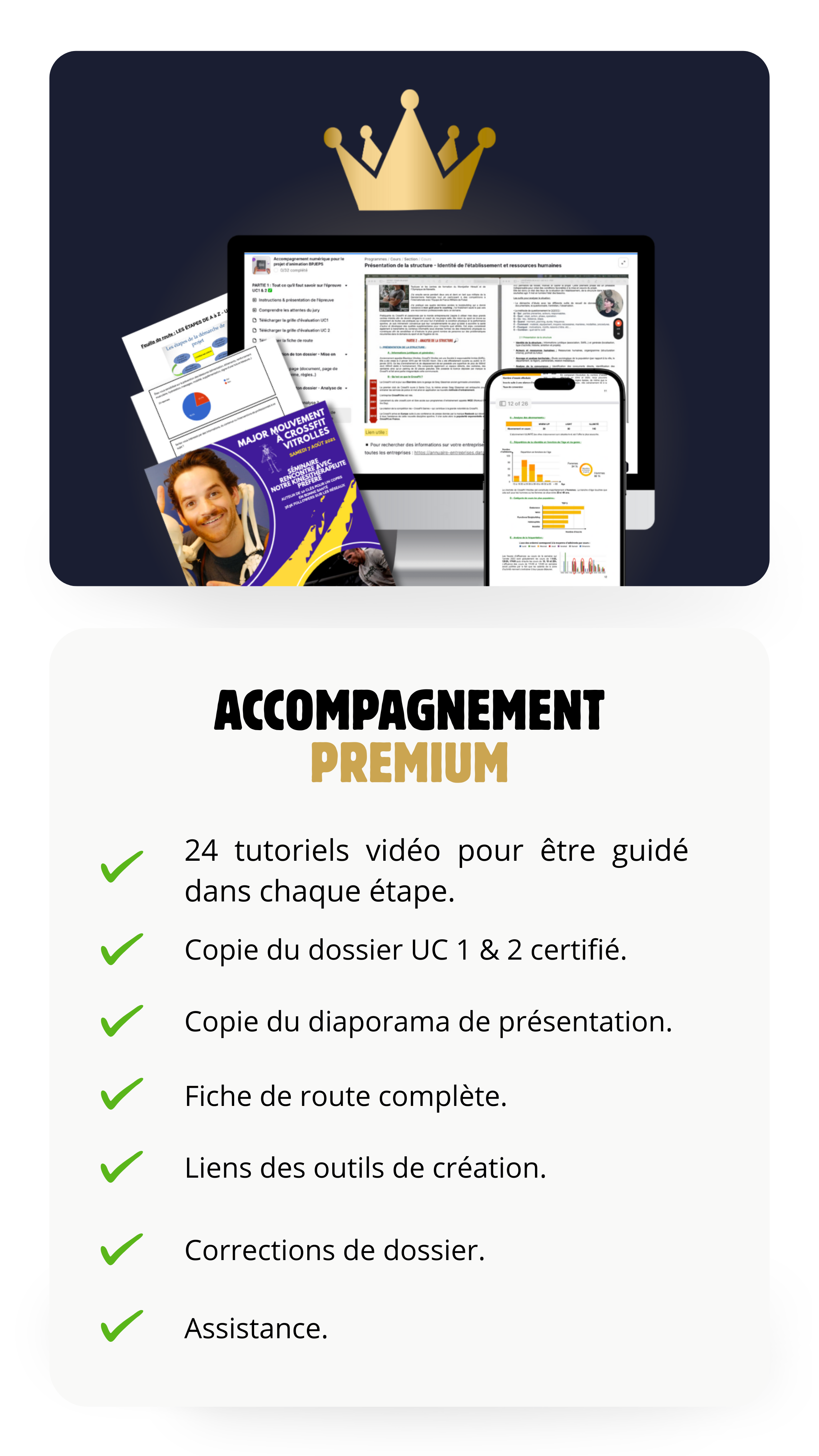 Cet accompagnement inclut un dossier UC 1 & 2 complet et certifié, une série de 24 vidéos explicatives, une feuille de route complète, et des outils concrets pour te guider étape par étape.